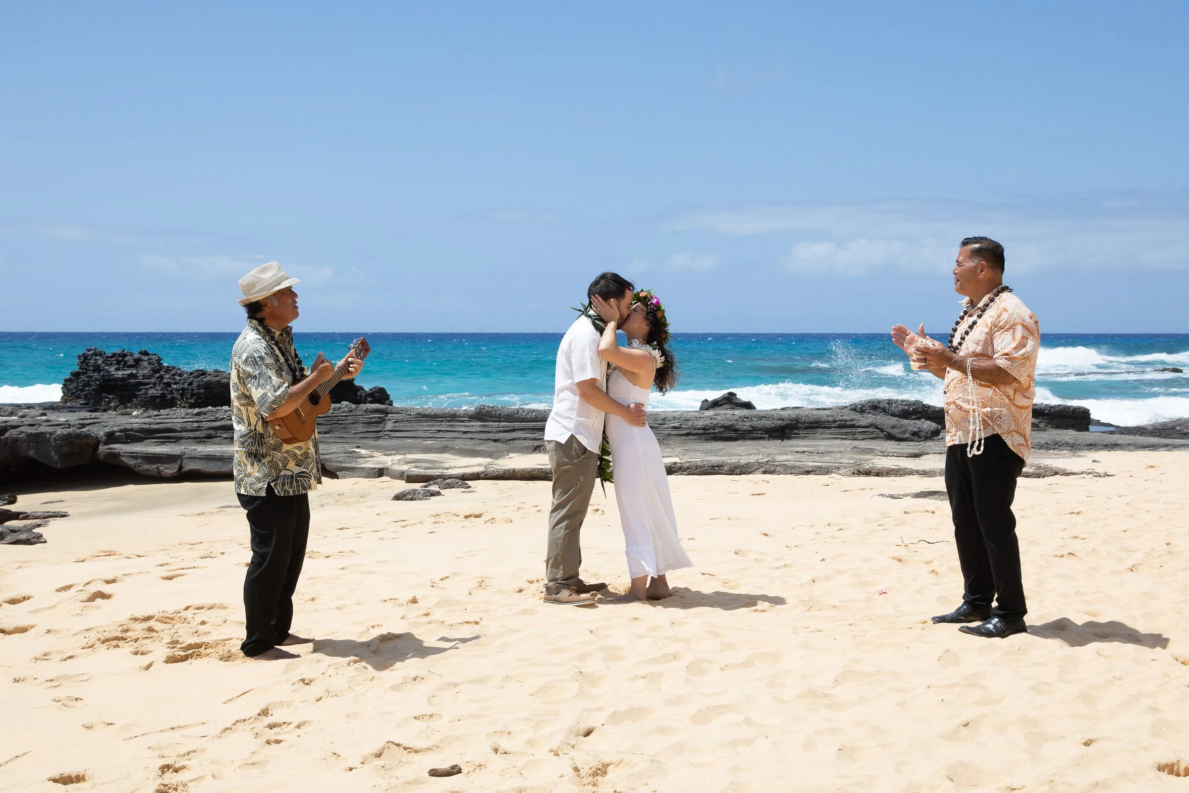 Most couples choose light, breathable attire. Brides often wear flowy dresses, while grooms opt for linen or aloha shirts. Comfortable footwear or barefoot ceremonies are also common on the sand.