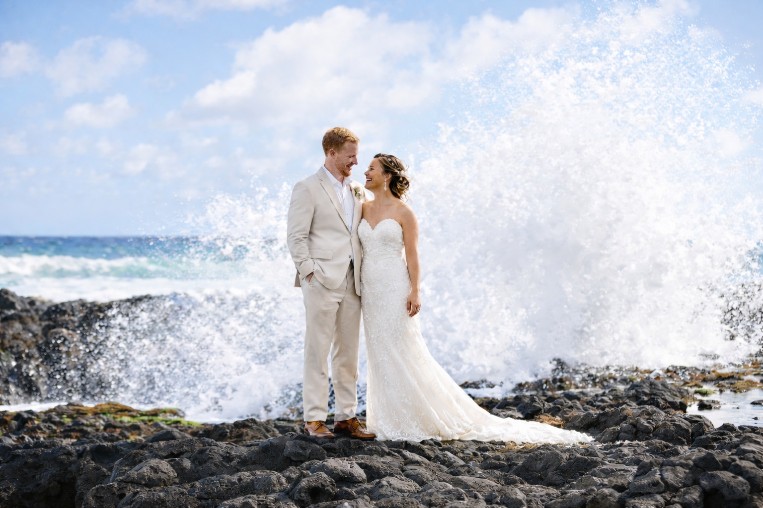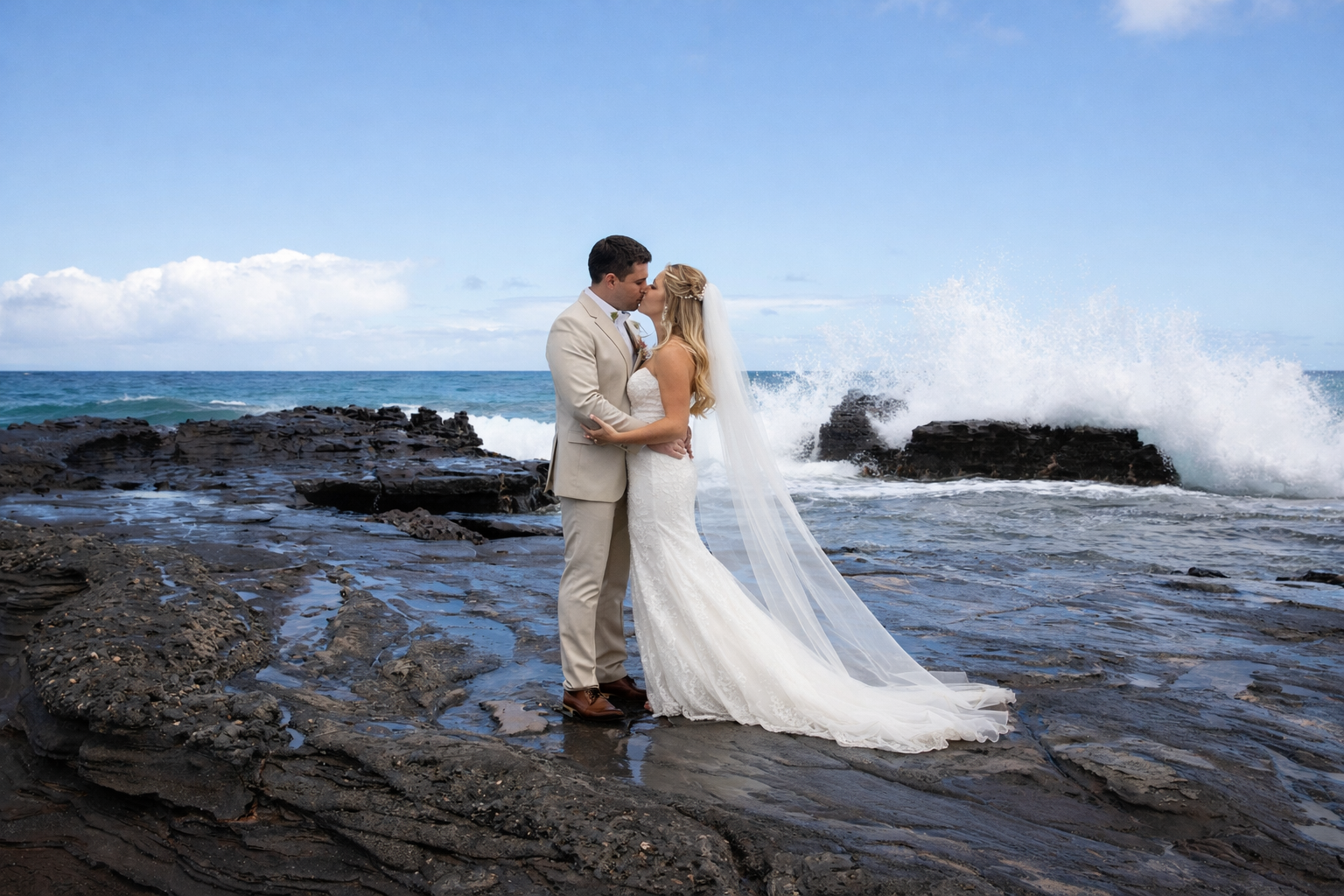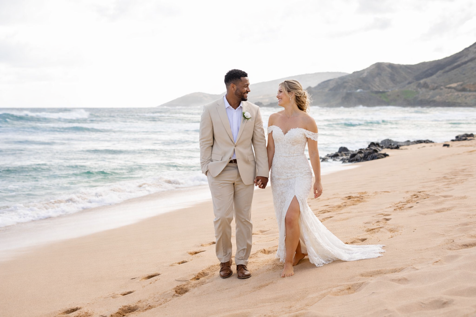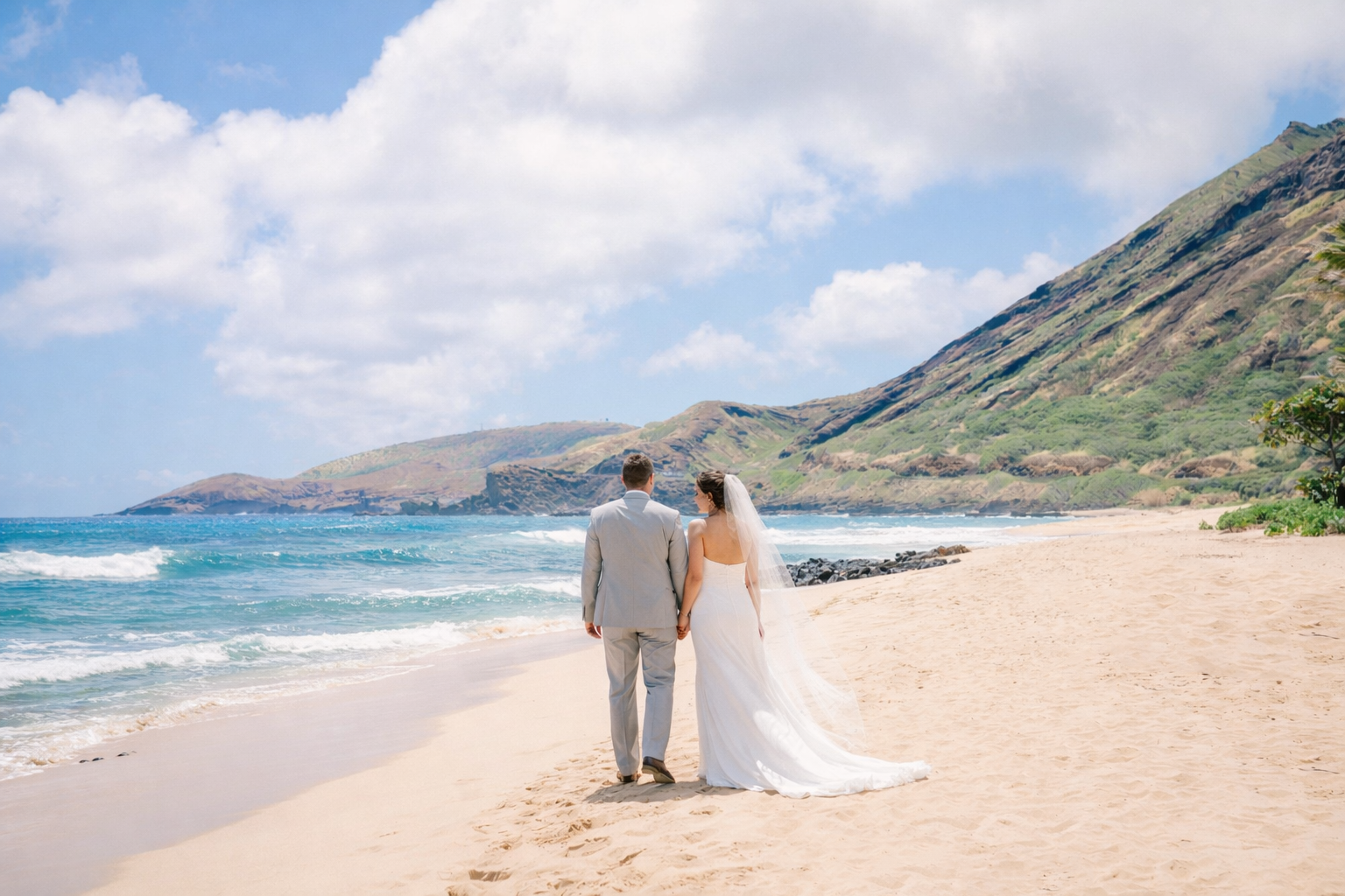 Most couples choose light, breathable attire. Brides often wear flowy dresses, while grooms opt for linen or aloha shirts. Comfortable footwear or barefoot ceremonies are also common on the sand.
